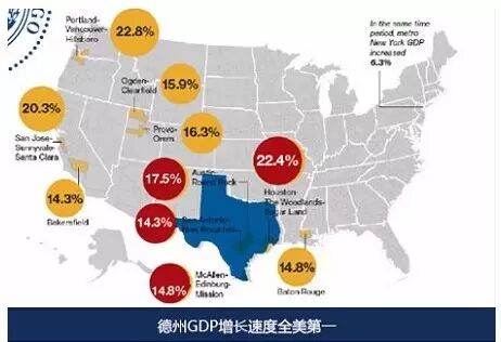 当然,并非只是生活成本低才吸引人们前来德州。工作机会也是吸引力之一。在过去的一年中,德州新增就业27.5万个,占全国所有新增就业的12%,比加州多5.1万。穆迪研究报告称,2015年全美国就业增长前十大城市德州占七个,其中前四大城市均在德州:奥斯丁、麦克米伦、休斯敦和达拉斯-沃斯堡。